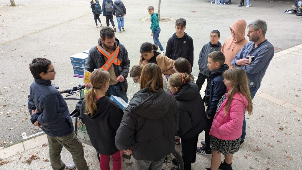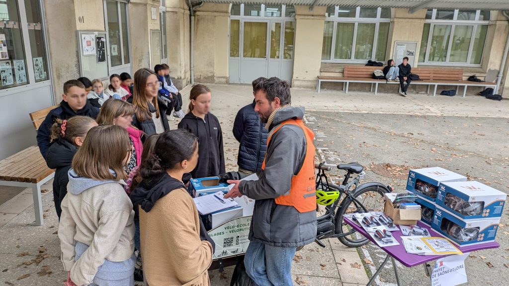 Vendredi 14 novembre 2025, Jacques, de Mines de Rayons, est venu animer dans la cour du collège sur le temps méridien un court atelier sur l’équipement essentiel pour sa sécurité à vélo.